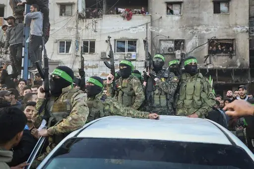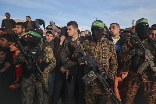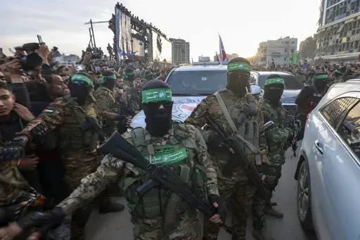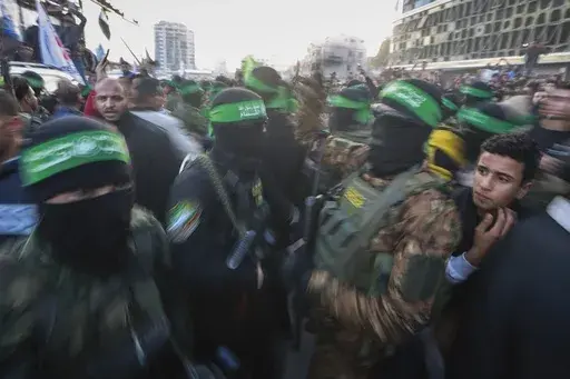 There was an element of theater in Sunday's handover of three Israeli hostages to the Red Cross, when dozens of masked Hamas fighters wearing green headbands and military fatigues paraded in front of cameras and held back a crowd of hundreds who surrounded the vehicles.
