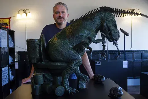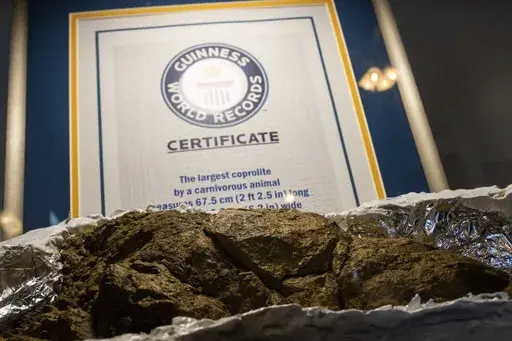 A highlight of Frandsen's collection is a specimen that holds a Guinness World Record for being the largest coprolite left by a carnivorous animal. Measuring more than 2 feet (61 centimeters) long and over 6 inches (15 centimeters) wide, Frandsen said it's believed to be from a T. rex, given where it was found on a private ranch in South Dakota in 2019.