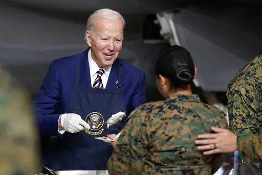 Later Monday, the Bidens traveled to Marine Corps Air Station, Cherry Point, near the North Carolina coast for “friendsgiving,” or to share a Thanksgiving-style meal with members of the military and their families. The first couple expressed gratitude for their sacrifices to the roughly 350 people in attendance.