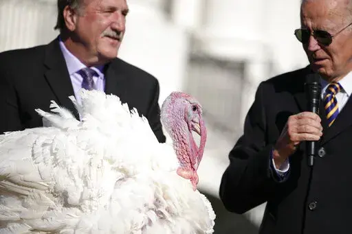 WASHINGTON (AP) — President Joe Biden continued a 75-year tradition Monday and pardoned a pair of Thanksgiving turkeys named after his favorite flavor of ice cream while cracking jokes about his political party's better-than-expected performance in this month's midterm elections.