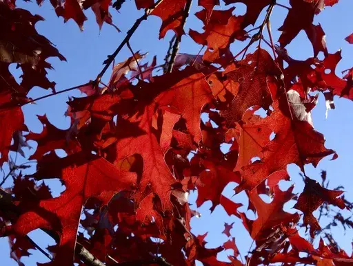 Scarlet oak (Quercus coccinea) grows best in full sun, reaching 50-70 feet tall, and blazes with red foliage in fall in horticultural zones 5-9. Red oak (Quercus rubra) has similar attributes, while white oak (Quercus alba) can handle cooler temperatures, so is suitable for zones 3-9, and can grow 10 feet taller.