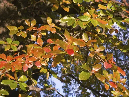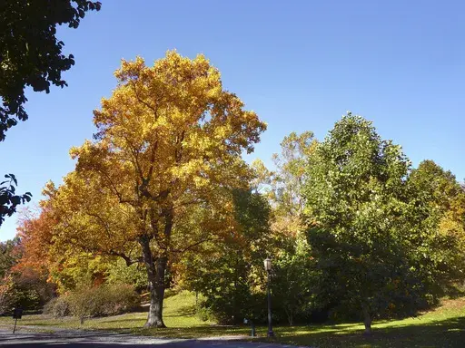 American persimmon (Diospyros virginiana) turns greenish-yellow in the fall. Grow it in full to part sun in zones 5-9, where it can grow as tall as 100 feet in rich, moist soil (shorter under less-than-ideal conditions). Plus, you’ll also get fruit.