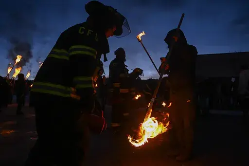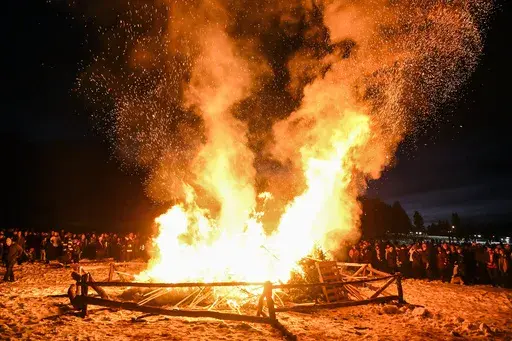 People set the tall beetle effigy on fire amid drum beats and chants of “Burn, beetle, burn." Firefighters kept watch, warning participants not to throw the torches, even as some people launched the burning sticks into pine trees piled at the base of the beetle. Fireworks dazzled overhead.