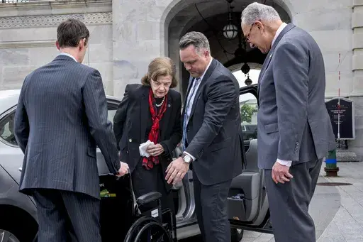 Looking noticeably thinner and frail, Feinstein is using a wheelchair to get around the Capitol as she continues to recover from a case of shingles. She missed the Senate’s first votes on Wednesday morning but arrived outside the Senate in a car for an afternoon vote, helped into the wheelchair by aides and greeted by Senate Majority Leader Chuck Schumer with a handshake and affectionate pat on the back.