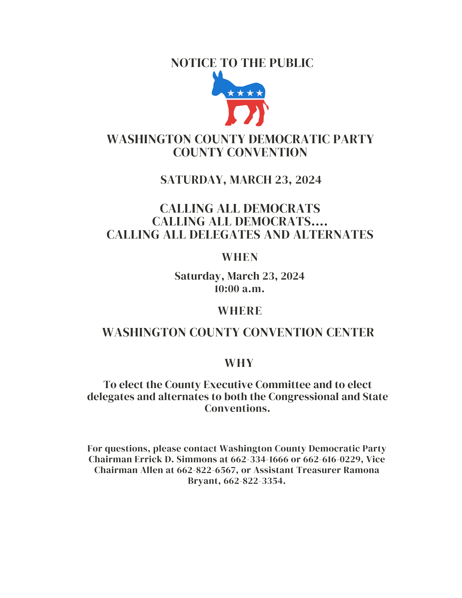 For further information, please call Washington County Democratic Party Chairman Errick D. Simmons at 662-334-1666 or 662-616-0229, Vice Chairman Allen at 662-822-6567, or Assistant Treasurer Ramona Bryant, at 662-822-3354.