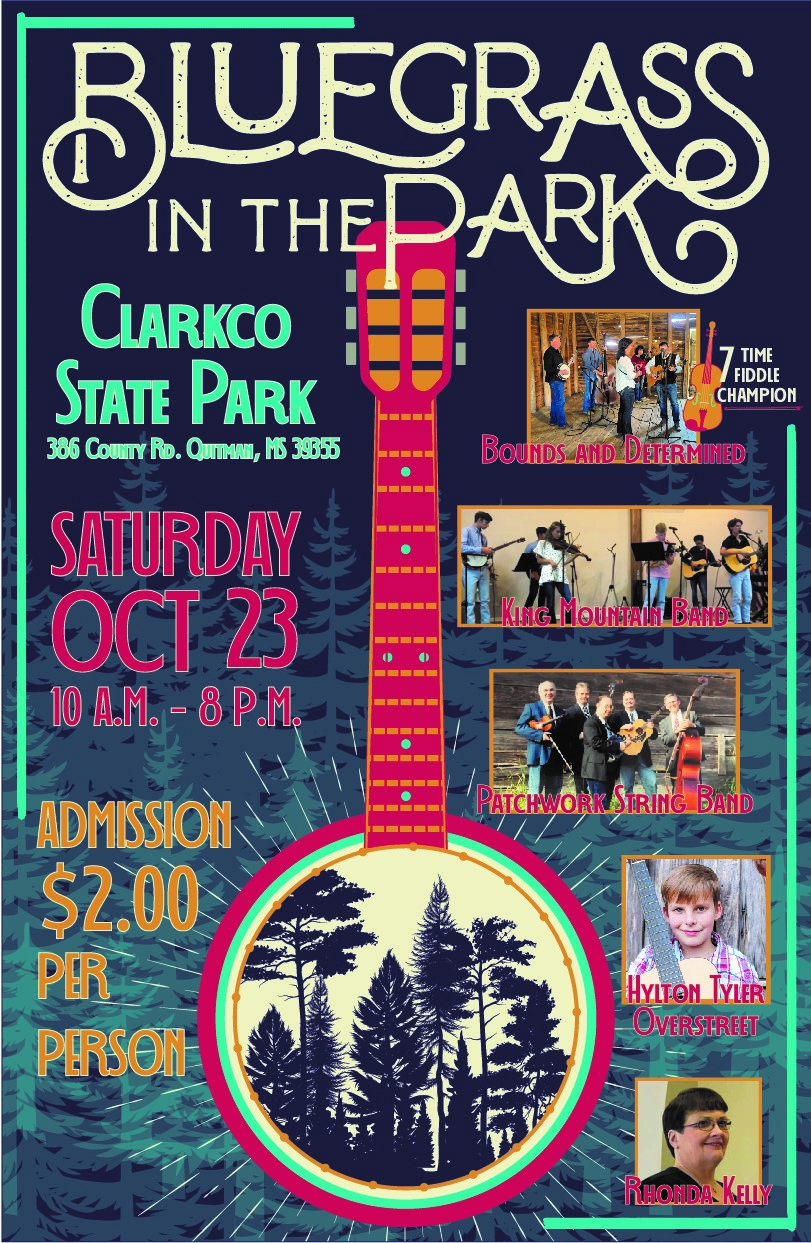 Friends of Clarkco is excited to have their annual Bluegrass in the Park at Clarkco State Park on October 23. The event will begin at 10:00 a.m. and last until 8:00 p.m.