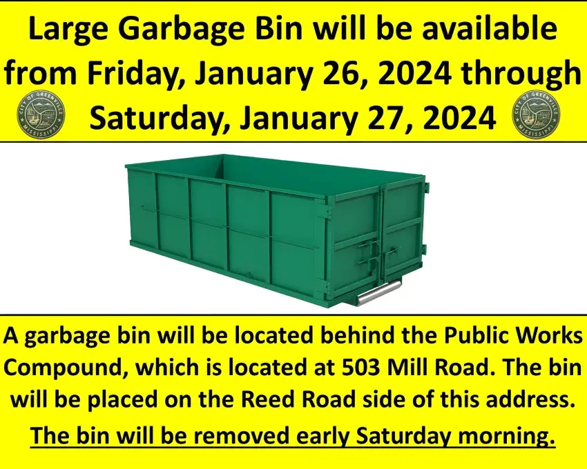 Mayor Errick D. Simmons and the City of Greenville announce that a large garbage bin will be available from Friday, Jan. 26, 2024, through Saturday, Jan. 27, 2024.
