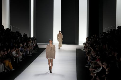 Models — including some older men, in a brand-first — emerged through mist into a striated cavern beneath Milan’s main railroad tracks, as if from a cave into the African dawn. They were accompanied by rhythmic electronic music.