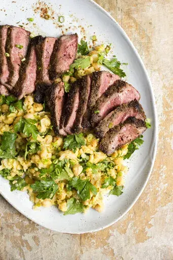 We then partially mash chickpeas and cook them in a skillet with chopped scallions. The warm salad is a perfect foil for the steak, which we sprinkle with a little more of the spice mixture after cooking it to double down on the flavor. A dollop of plain yogurt and warmed pita bread will round out the meal.