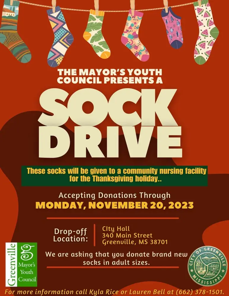 Greenville, Ms. Nov 10, 2023, Mayor Errick D. Simmons announces that the Mayor's Youth Council is leading a sock drive to give elderly residents a warm holiday surprise during the week of Thanksgiving. The sock drive will end on Monday, November 20, at 5 p.m.