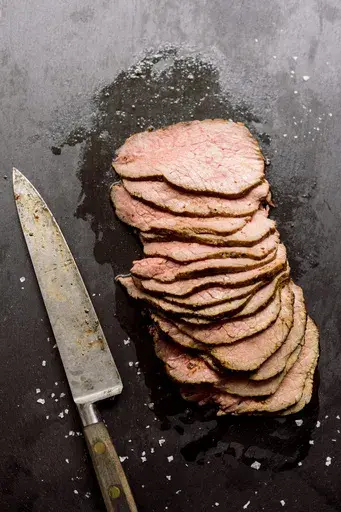 A prune-based marinade helped us transform an economical eye round into a tender and juicy roast. To boost the marinade’s effect, we trim the silver skin and also poke the meat repeatedly with a fork. The roast beef tasted best after marinating for 48 hours, but 24 will work, too. Serve thinly sliced with fresh horseradish sauce for a clean, contrasting bite.