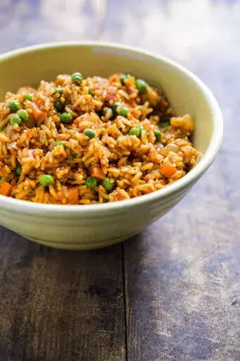 With up to 20 possible ingredients and countless variations, we focused on common denominators to pare down the list to essentials. Nutty, fragrant basmati rice is seasoned with paprika, curry powder and thyme, then we simmer the grains with chopped carrots in a puree of tomato, red bell pepper and garlic. Frozen peas warmed in the residual heat as the rice finishes absorbing the liquid helps retain their texture.