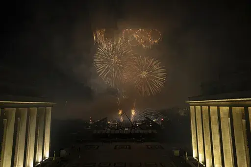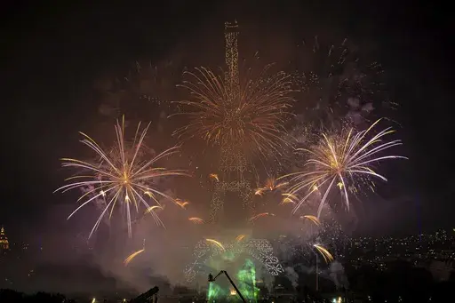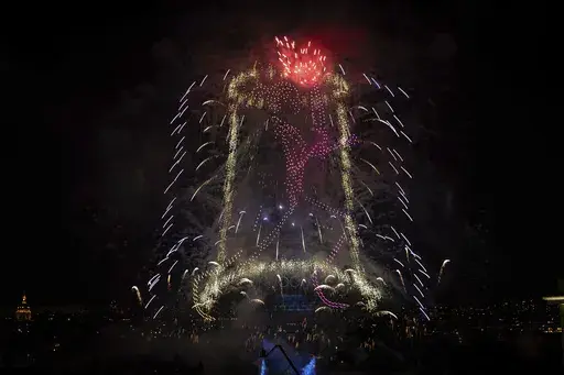 But that, too, was all about the 2024 Games: While fireworks burst out from the tower itself, illuminated drones formed shapes representing Olympic sports, suspended over the adjacent Seine River — right where the opening ceremony is scheduled to take place July 26.
