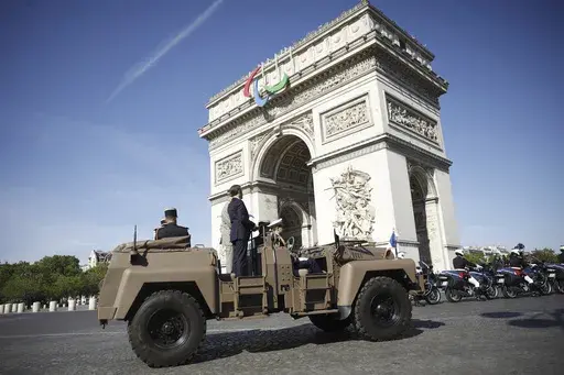 Just 12 days before the French capital hosts exceptionally ambitious and high-security Summer Games, the torch relay joined up with thousands of soldiers, sailors, rescuers and medics marching in Paris beneath roaring fighter jets. And the day wrapped up with a spectacular Olympic-themed light show at the Eiffel Tower.