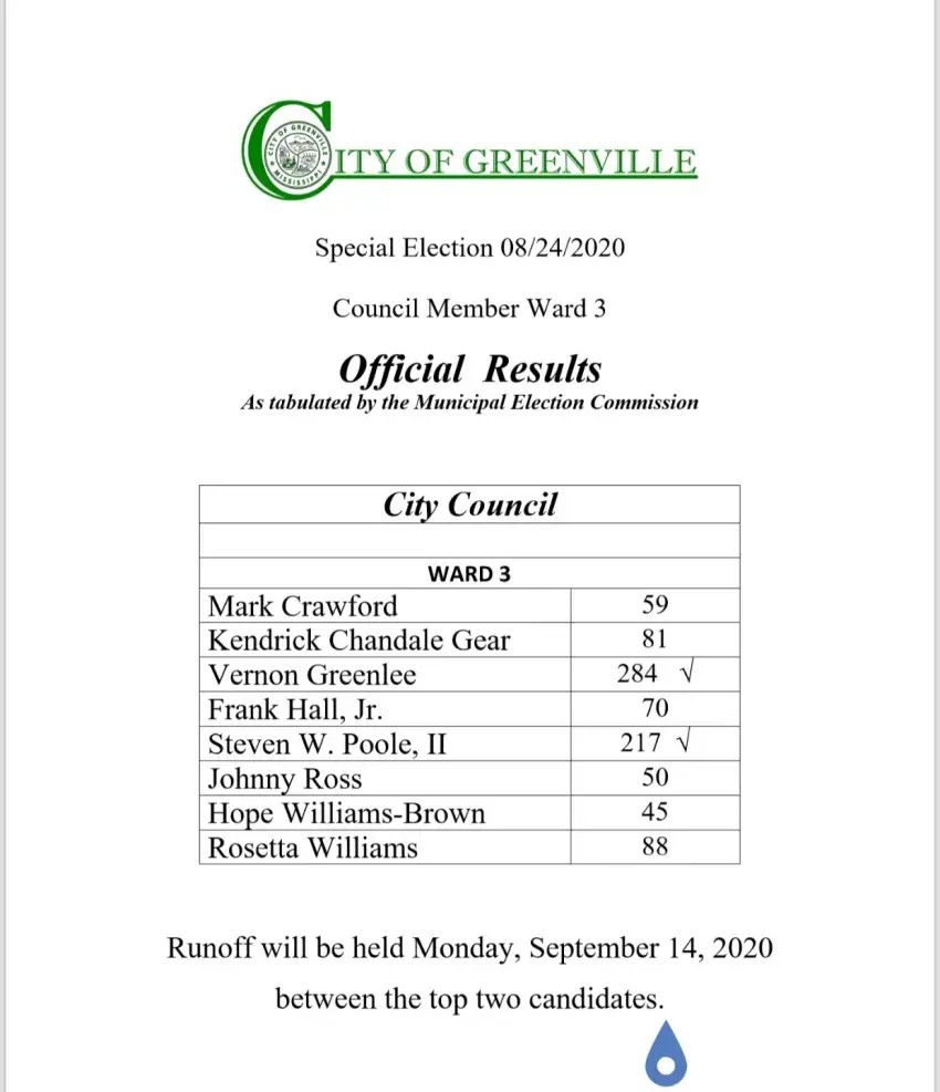 “The community turn out exceeded our expectations. Thank you to the 894 voters that cast their ballot on Monday. I look forward to meeting and gaining support from more of you in Ward 3 before the runoff election on September 14. Please call me at 662-336-5668 with your questions and concerns. I am honored to have the possibility of representing the citizen of Ward 3 on the City Council,” Greenlee said.