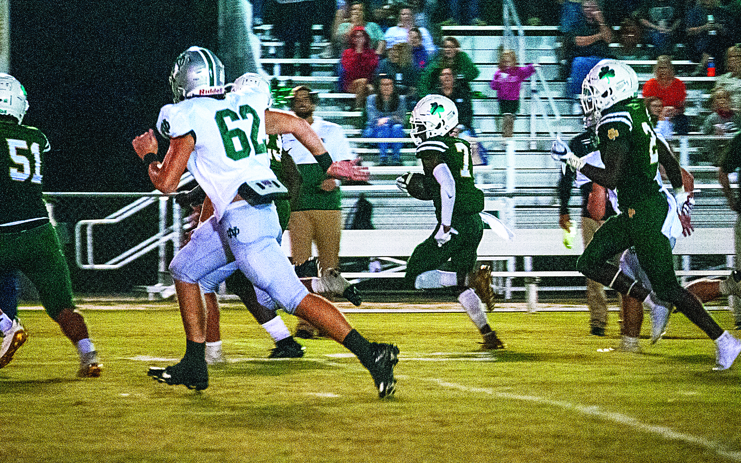 An 82-yard interception return by Jerrian King put the Irish up 13-7 with 1:29 left in the second quarter. King would score again on an 85-yard touchdown after receiving a screen pass from quarterback C.J. Moore and then racing around and past a number of North Delta defenders.
