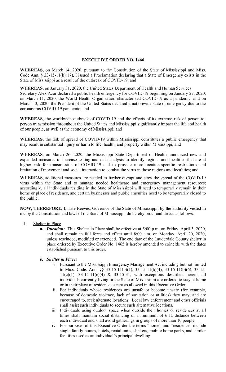 Mississippi is rapidly increasing testing and strictly enforcing quarantines for anyone that investigators believe has been exposed to the virus. The shelter-in-place will begin this Friday, April 3, 2020 at 5 p.m. and be in effect until Monday, April 20, 2020 at 8 a.m.