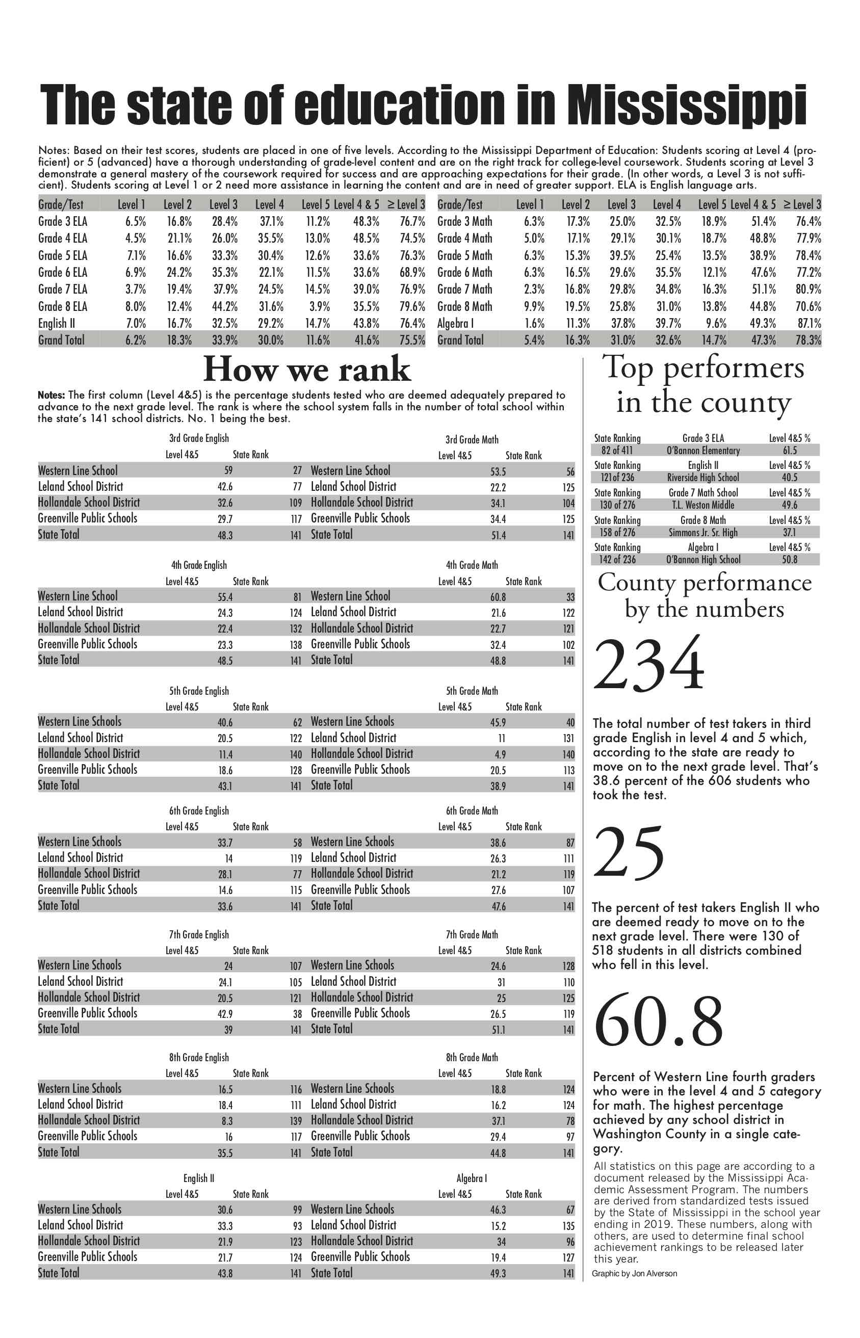 Western Line School District was the highest ranked district in the county in third grade English language arts results at No. 27 out of 141 districts in the state. Exactly 59% of WLSD students were ranked in level 4 and 5. Leland was No. 77, Hollandale was No. 109 and Greenville Public Schools was No. 117. All told, 38.6% of students in the county were ranked in level 4 and 5 in third grade English.