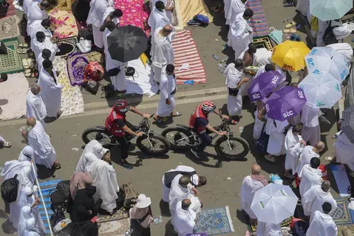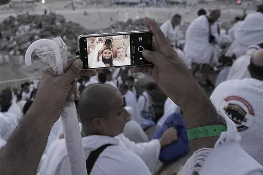 Some prayed, whispering their appeals to God with their palms raised open to the skies. Some pondered the landscape as the light of daybreak crept across it. Others raised their arms in the universal gesture of taking a selfie to commemorate the moment. Giant ring-shaped sprinklers sprayed mist trying to cool the pilgrims in the heat that rapidly spiraled to 45 degrees Celsius (113 degrees Fahrenheit).