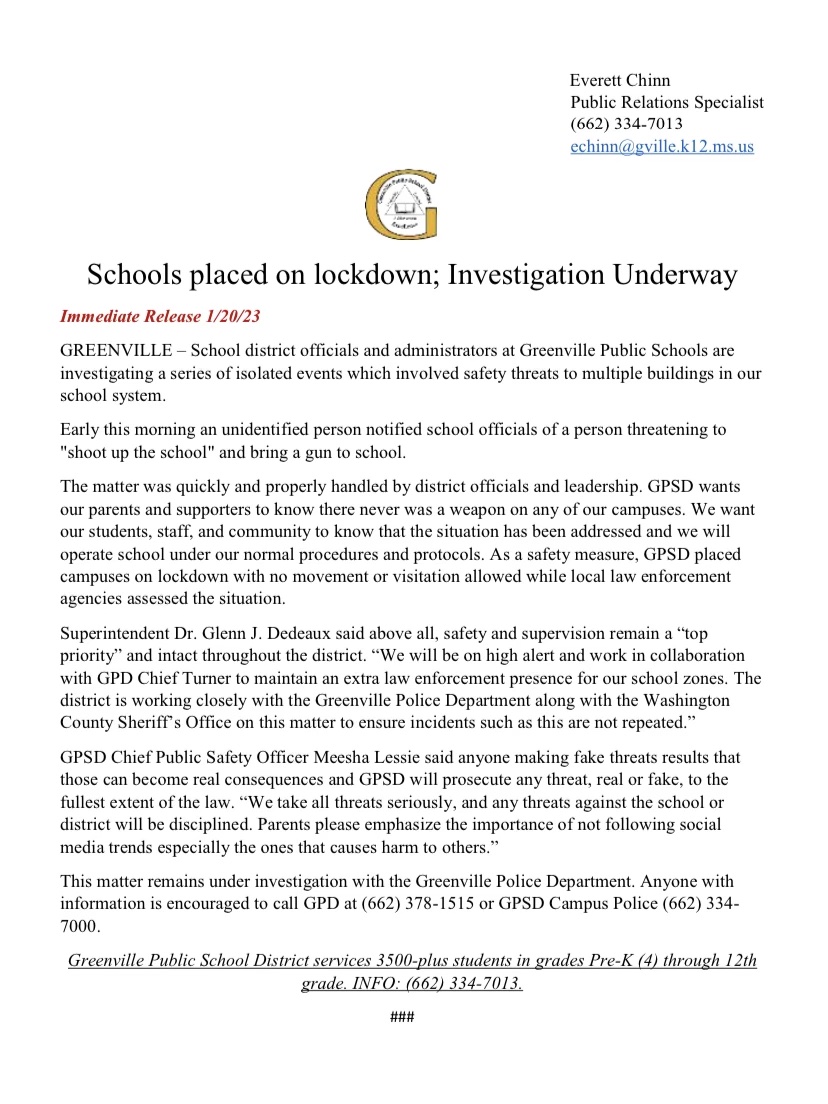 Superintendent Dr. Glenn J. Dedeaux said above all, safety and supervision remain a "top priority" and intact throughout the district. "We will be on high alert and work in collaboration with GPD Chief Turner to maintain an extra law enforcement presence for our school zones. The district is working closely with the Greenville Police Department along with the Washington County Sheriff's Office on this matter to ensure incidents such as this are not repeated.