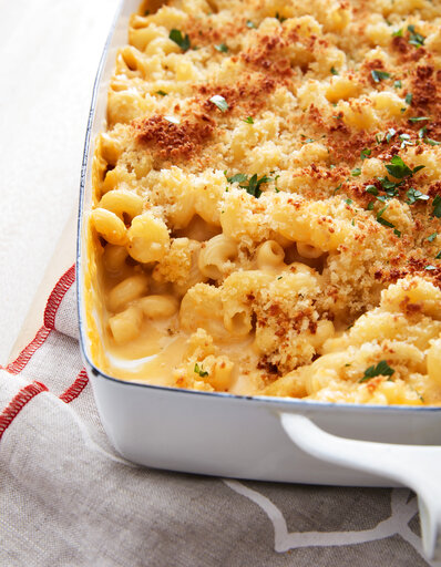 Sprinkle the breadcrumbs over the macaroni and cheese. Bake for about 15 minutes, or until the sauce is bubbling. Then turn on the broiler and broil for 1 to 3 minutes, until the breadcrumbs are golden brown. Let cool for 5 minutes before serving and sprinkle the top with the parsley.