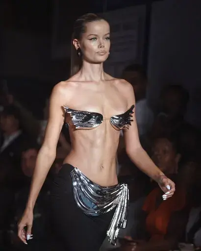 Norwegian model Frida Aasen sported a bralette made of silver wings and a matching silver waist sash over a sheer black figure-hugging skirt.