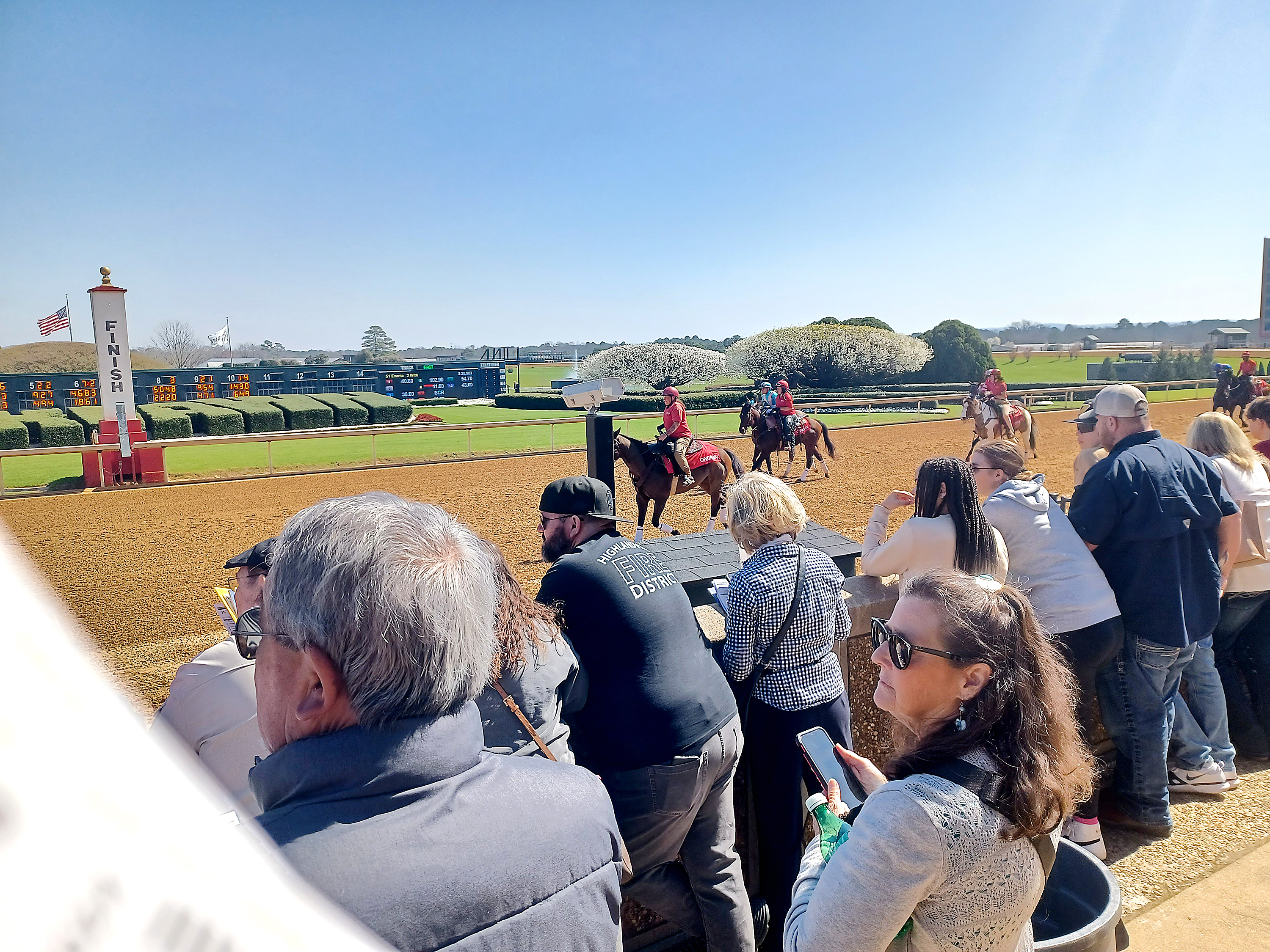 It couldn’t have been a more picture perfect late winter day in the ever greening Ouachita Mountains. The sun seemed to radiate first from the beauty of the horses who trotted across the light brown dirt as I stepped outside. The white blazes down the middle of the horses’ faces gave some of them even more character. The colors of the horses’ saddlecoths glistened in the Arkansas sun. The No. 1 was wearing a sparkling cherry apple red. The jockeys in their colorful silk shirts added to the panorama.