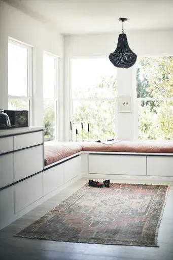 She didn't want to do any renovation work, so instead she worked with designers from California Closets to decorate and build out a small, windowed pass-through to the closet. They created a built-in dresser and hanging area, then wraparound seating with roomy drawers. With a calm palette of blush-toned neutrals, it also has a pendant light made of wood beads, and a framed artwork that says “AH.”