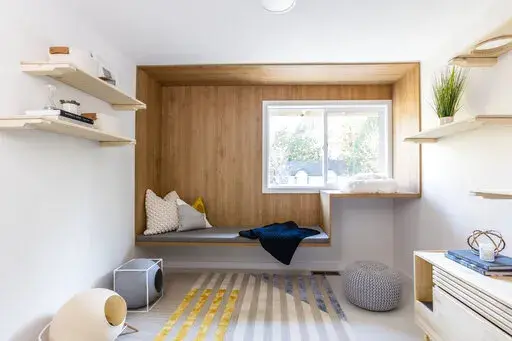 For a cat-loving client, designer Anna Popov in Redmond, Washington, created a “me and the pets” space. A spare bedroom became a reading room for the humans, and Popov installed climbing shelves and several cubbies for the feline ones. She says the space is now referred to as the “everybody wants to be a cat” room.