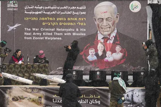Hamas militants displayed four black coffins on a stage amid the ruins of the southern city of Khan Younis on Thursday surrounded by banners, including a large one depicting Prime Minister Benjamin Netanyahu as a vampire. Thousands of people, including large numbers of masked and armed militants, looked on as the coffins were loaded onto Red Cross vehicles before being driven to Israeli forces.