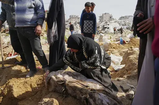 Shifa was once the largest medical facility in the Gaza Strip but is severely damaged, with its walls collapsed and scoured by flames and bullet holes. The mass grave is in a courtyard strewn with trash, rubble, and placards bearing the names of those buried.