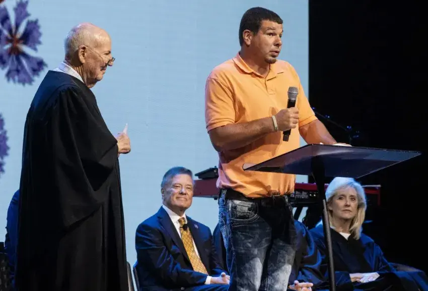 There were a couple of surprises: One graduate proposed marriage to his girlfriend. She accepted. Each graduate received an envelope along with their diploma. It was a gift of $500 each from the ceremony’s keynote speaker, billionaire businessman Thomas Duff, a big supporter of drug court whose companies in the area hire many people in the program.