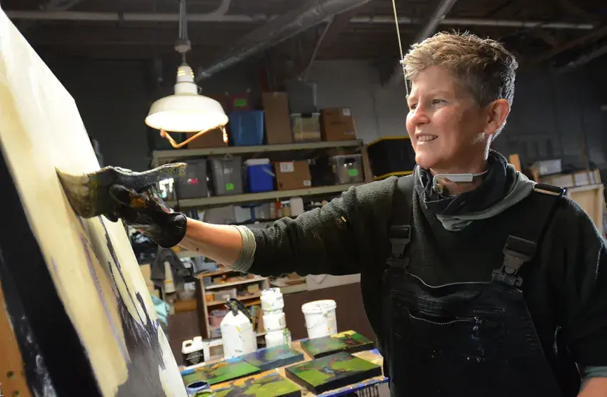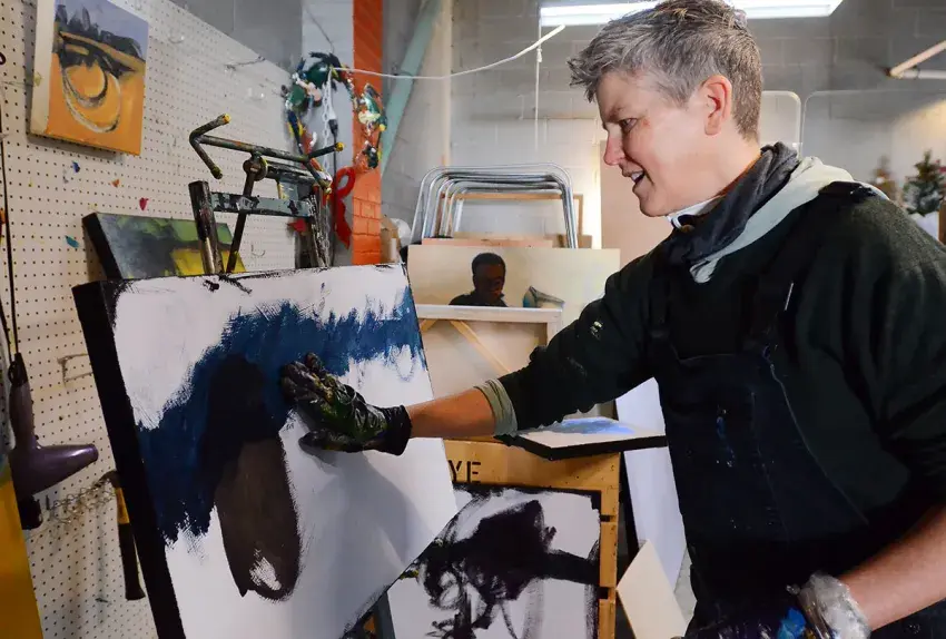 There’s a preciseness to artist Ellen Langford’s movements as she works on multiple projects in the workplace studio she shares with other artists.