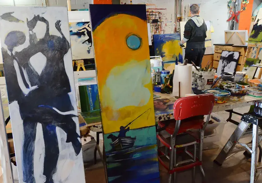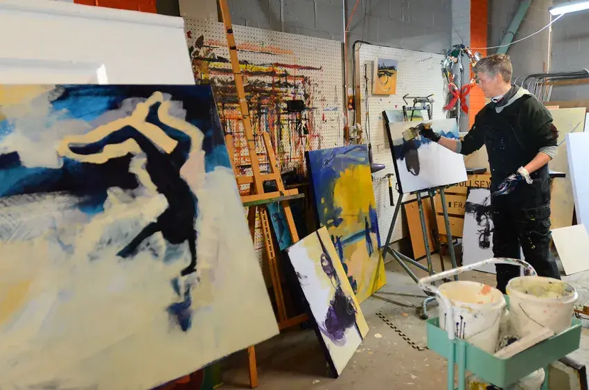 She stands for a moment with brush in hand, wearing paint-splattered coveralls, scrutinizing three paintings in progress. Then, she begins again, on all three.