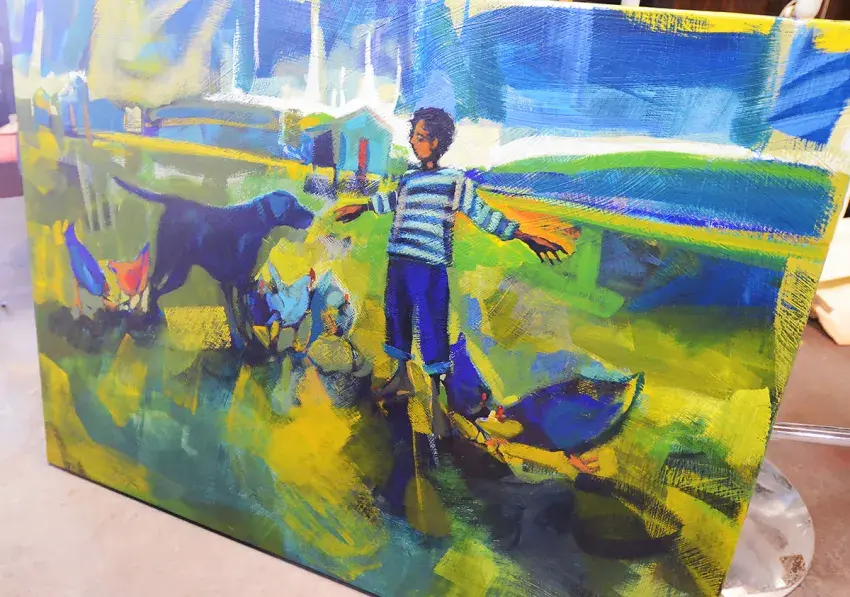 Her paintings set forever in time a simplicity often missed or taken for granted by the hustle and bustle of life — a silhouetted figure lost in somersaults, an angler with a dog enjoying a day of fishing or how colors combine to create the sun’s kiss making ordinary leaves extraordinary.