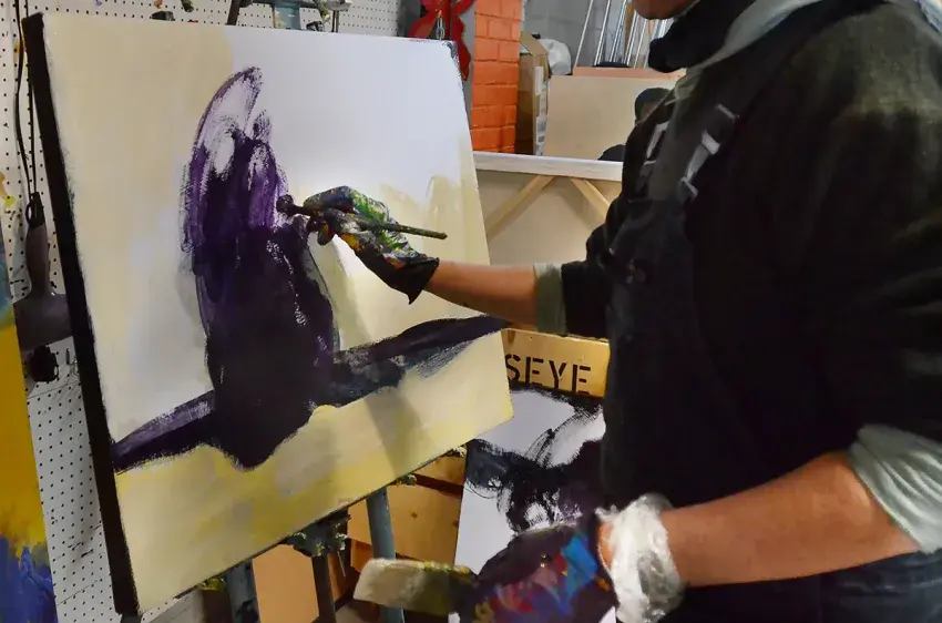 A paused paintbrush is replaced by a gloved finger to smear on more color.