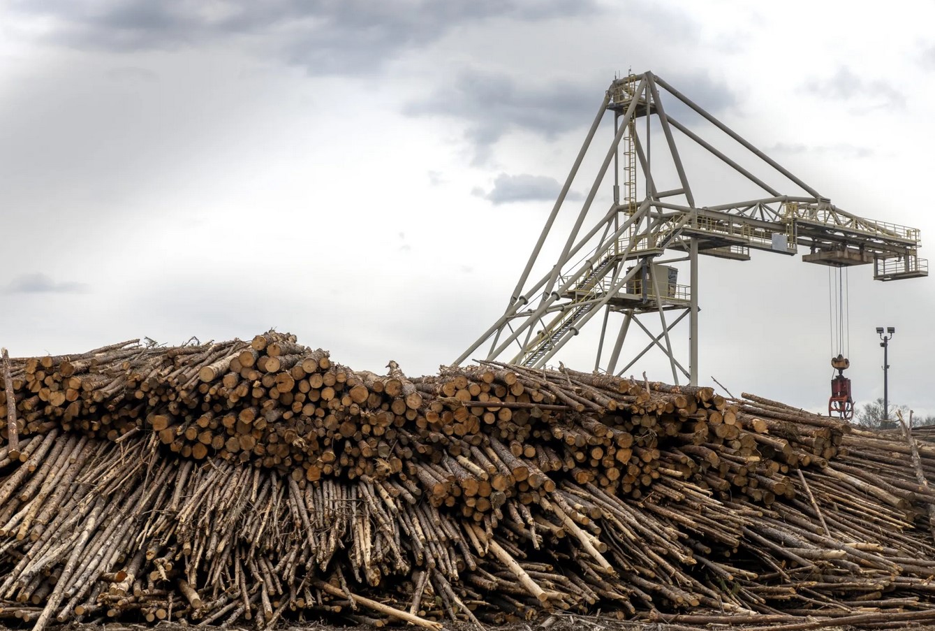 Wood is in place at Drax Group in Gloster, Miss., on Friday, Feb. 16, 2024. Some Gloster residents are concerned with the industrial pollution caused by the company that produces wood pellets in the town. Credit: Eric J. Shelton/Mississippi Today