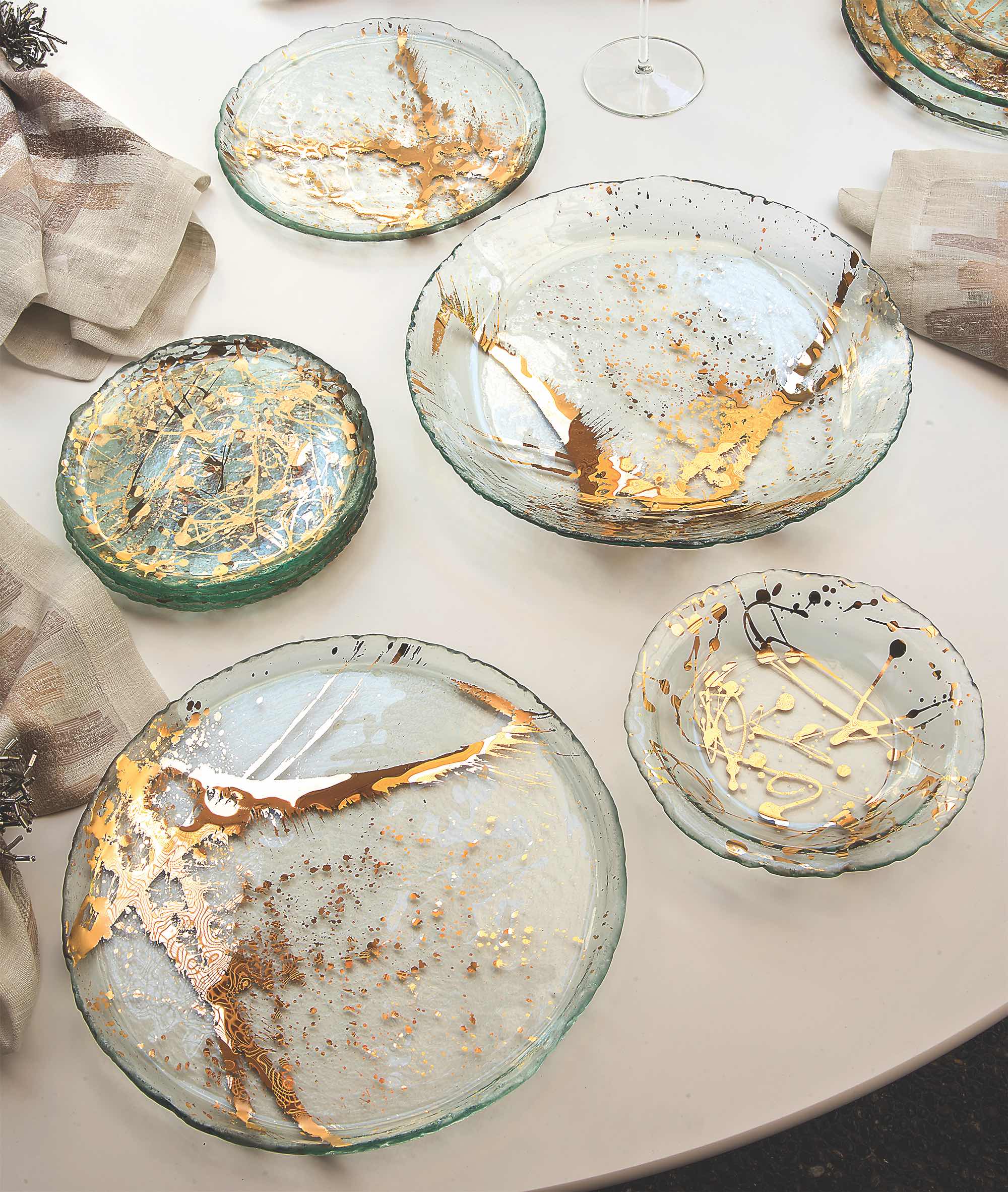 Her pieces are made from window glass that is melted over molds at high heat, fusing the precious metal, gold or platinum permanently into the glass. To add a final, personal touch, each piece is then engraved with the studio signature on the back.