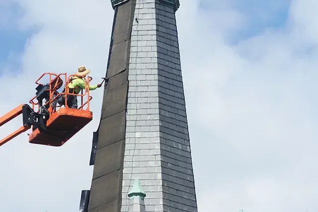 The tile removal is part of a $1 million renovation to much of the church’s structure. There is work being done inside the steeple and inside the building as well as on the roof.