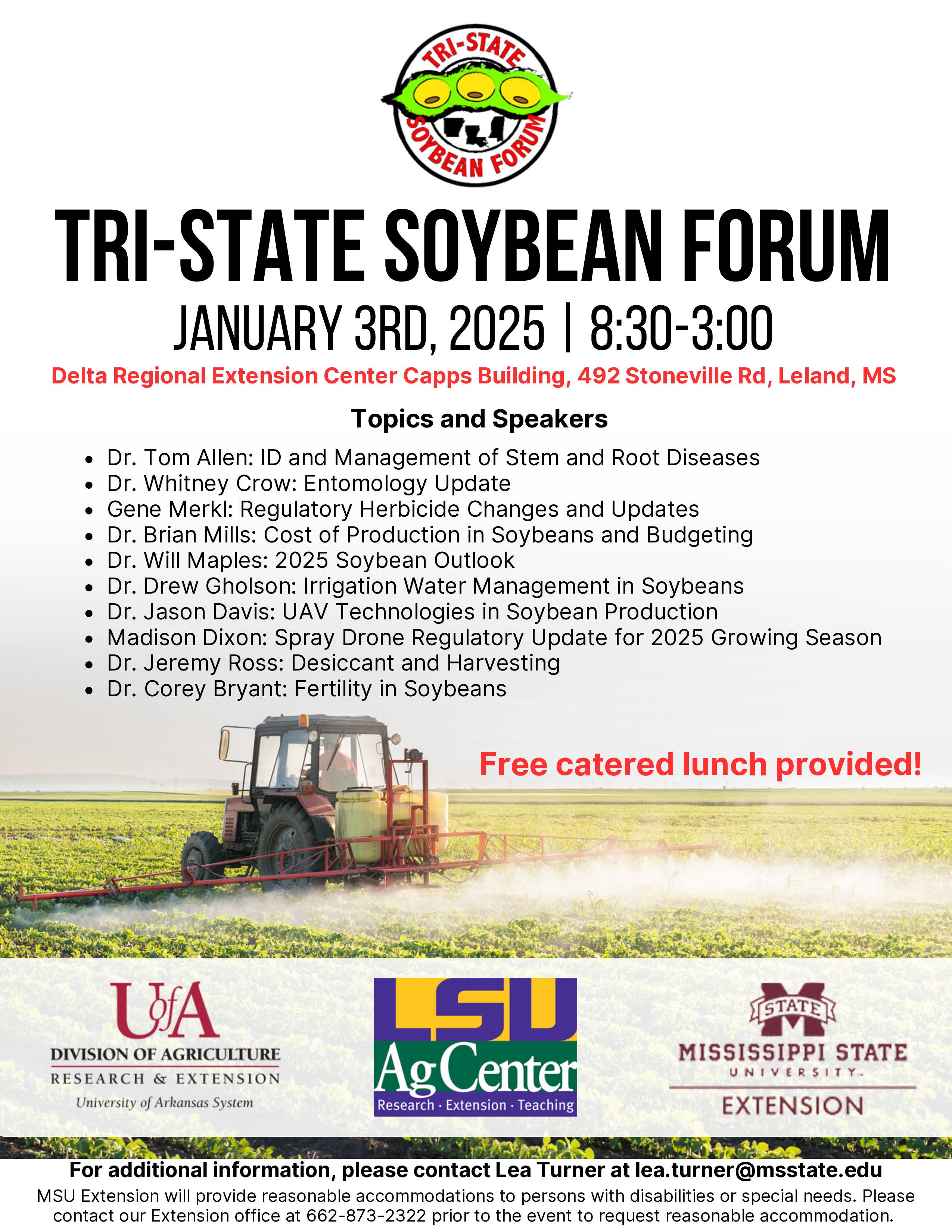 The Annual Tri-State Soybean Forum is on January 3rd, 2025 at 8:30 am. Mississippi State Extension Service is hosting this year, located at the Delta Regional Extension Center at the Capps Building, 492 Stoneville Road, Leland, MS 38756. This year's Tri-State Soybean Forum focuses on the most up-to-date research from a variety of researchers for the Mississippi, Arkansas, and Louisiana extension services, detailed in the attached agenda. Please help spread the word to your producers and anyone involved in the soybean industry to ensure they have access to this valuable event. We are preparing for a wonderful event with catered, free lunch for all who attend. Attendance is free as well.
