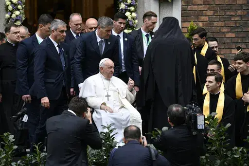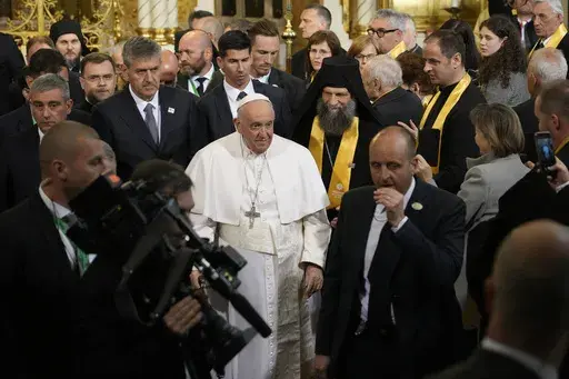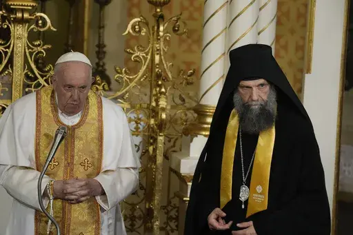 BUDAPEST, Hungary (AP) — Pope Francis plunged into both sides of Russia's war with Ukraine on Saturday, greeting some of the 2.5 million Ukrainian refugees who have fled across the border to Hungary during a public prayer service and then meeting privately with an envoy of the Russian Orthodox Church that has strongly supported the war.