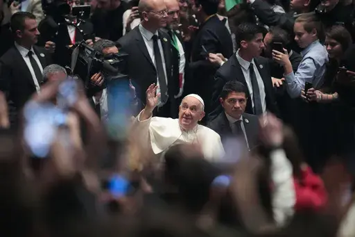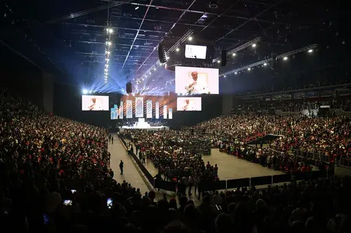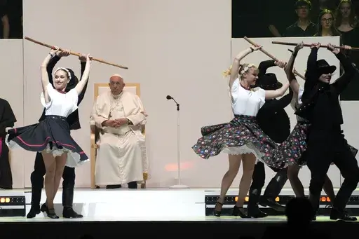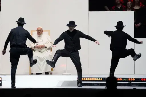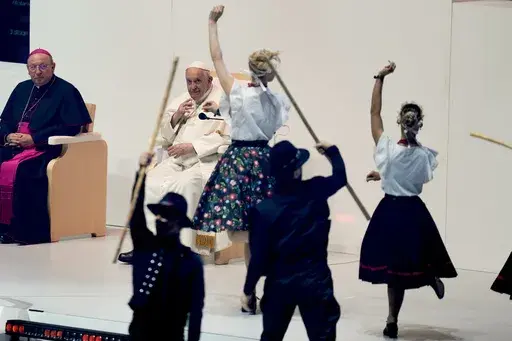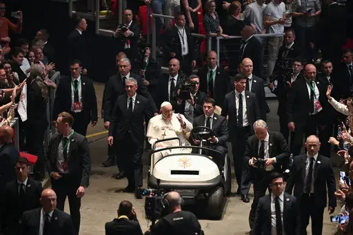 In an event staged like a rock concert, Francis jazzed up the crowd riding around in a mini golf cart-like vehicle. And he repeated his frequent appeal to young people to put aside their cellphones and get back to socializing face-to-face: “Please don't virtualize your lives,” he said to laughs.