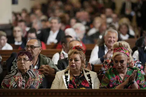 At the end of the event, a band of Hungarian Roma musicians serenaded the pontiff, drawing a standing ovation and cheers from the crowd and a thumbs-up from Francis.
