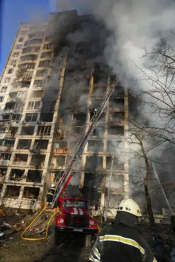 Artillery fire echoed through Kyiv on Tuesday as Russia launched strikes that ignited a huge fire in a 15-story apartment building apartment. Zelenskyy said barrages also hit four multi-story buildings, killing dozens of people.