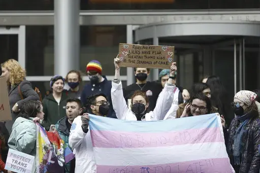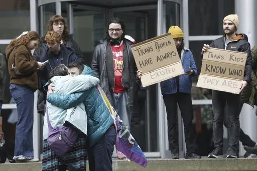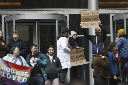 A large crowd of people went to the federal courthouse to watch Friday's hearing. Outside, some carried signs with phrases including “Protect Trans Kids” or Pride flags with the words, “You are loved.”
