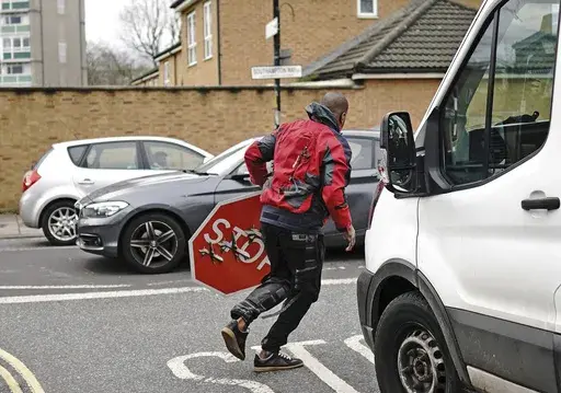 Witnesses who arrived at a street corner Friday in the south London section of Peckham less than an hour after Banksy posted a photo of the work on Instagram said they were stunned to watch a man with bolt cutters remove the sign as another man steadied a bike he stood on.