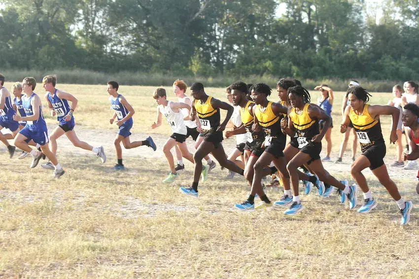 The Greenville High School boys cross country team (pictured on left) race out in the beginning of Wednesday's cross country meet at the Greenville Levee. Out of 14 teams, the Hornets took first place.