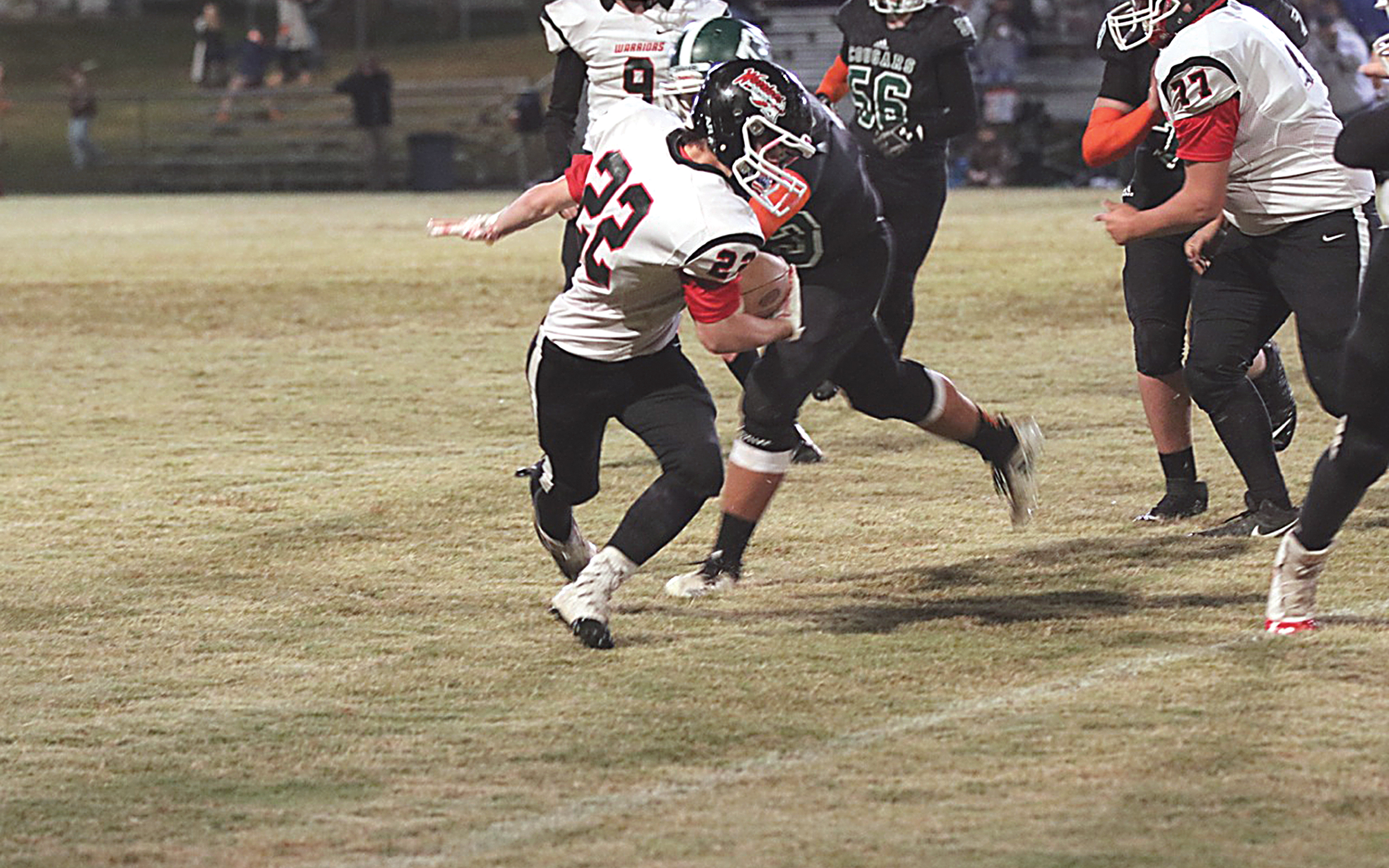 CALHOUN CITY — The Deer Creek School football team emphatically won its final game of the season as Noah Allegrezza led the way for the Warriors by scoring three touchdowns. Allegrezza rushed in two touchdowns and also returned an interception for a TD.