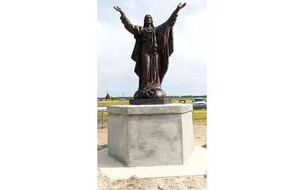 The statue is a replica of the “Word of Life” mural on the campus of the University of Notre Dame. The mural is more popularly known as Touchdown Jesus.