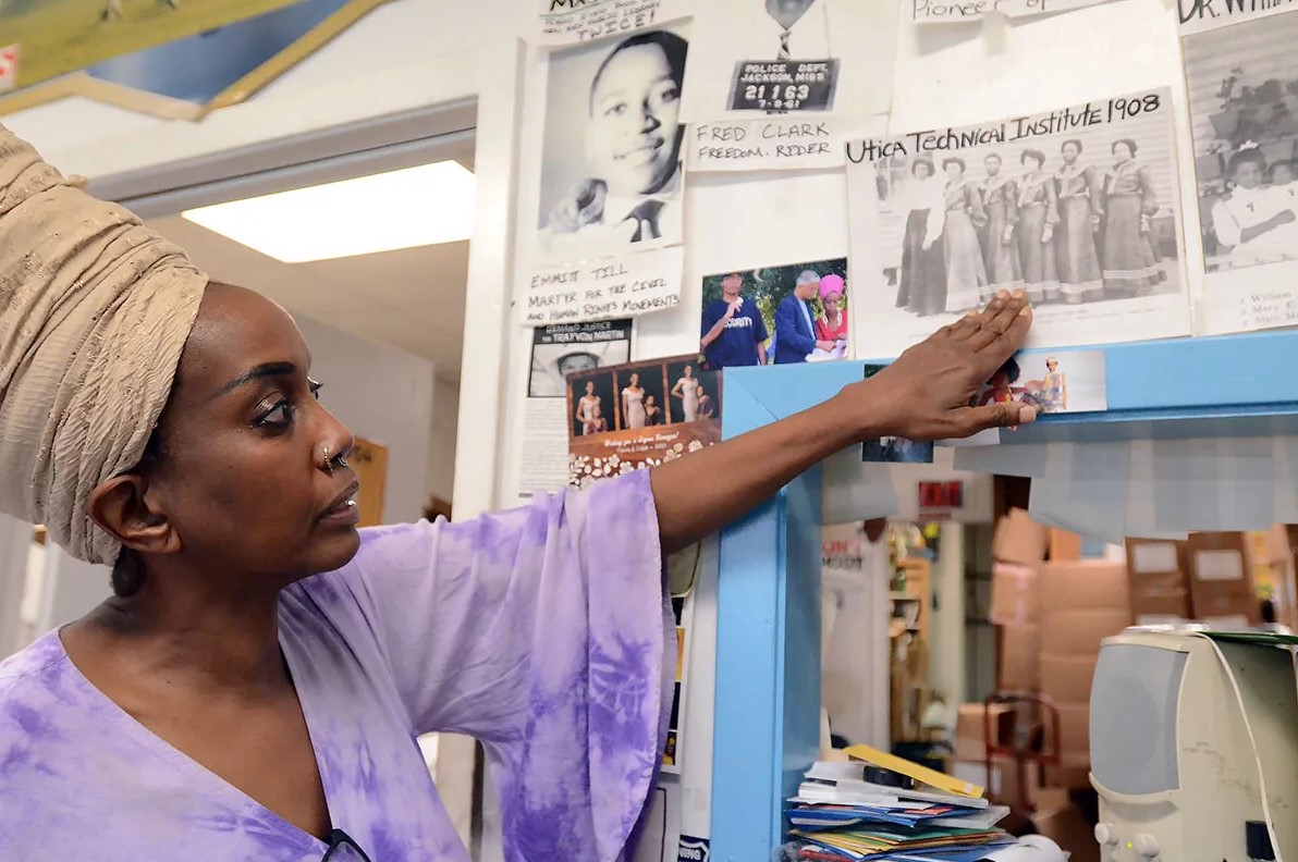 “My great grandmother was enslaved. When she freed herself, she started a church, school and burial grounds. She was an educator too. To this day, the church and burial grounds still remain,” Primm said, while showing an image taken in 1908 of her grandmother with classmates at Utica Technical Institute.